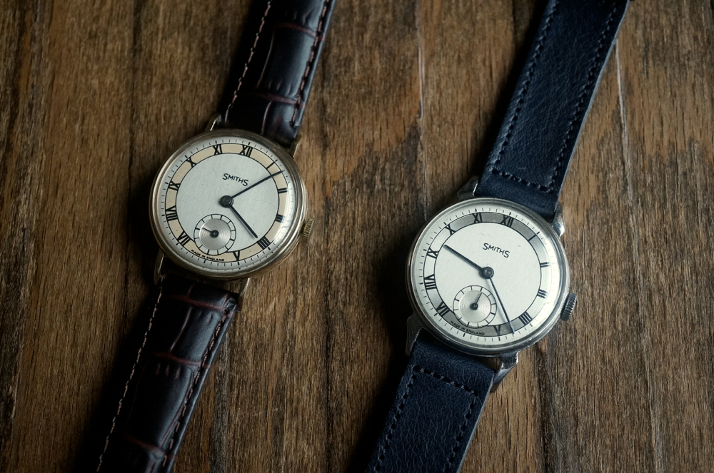 文字盤は限りなく同じデザインですが、左はゴールド(金無垢)ケース用、右はシルバー(クロームプレート)ケース用。反射板のように仕上げたインデックス部分の隈取りの色合いが、微妙に異なるのが分かります。デラックス以前のアーリー・スミスの中でも、特にローマ全数字のモデルは極めて稀少。金無垢ケースに至っては言わずもがな。