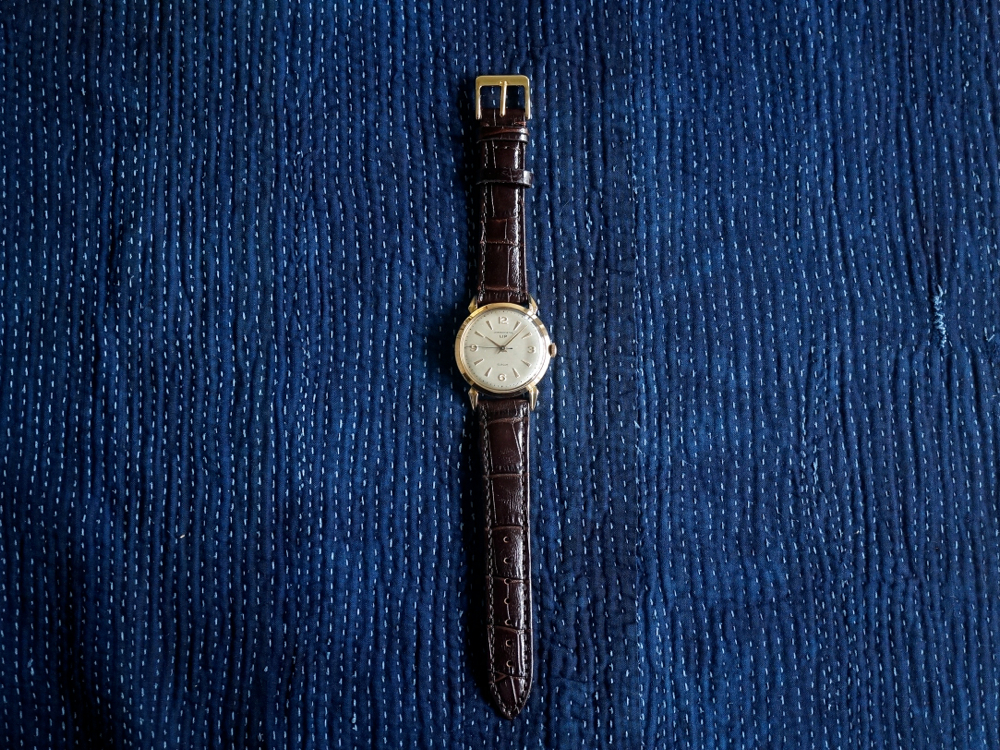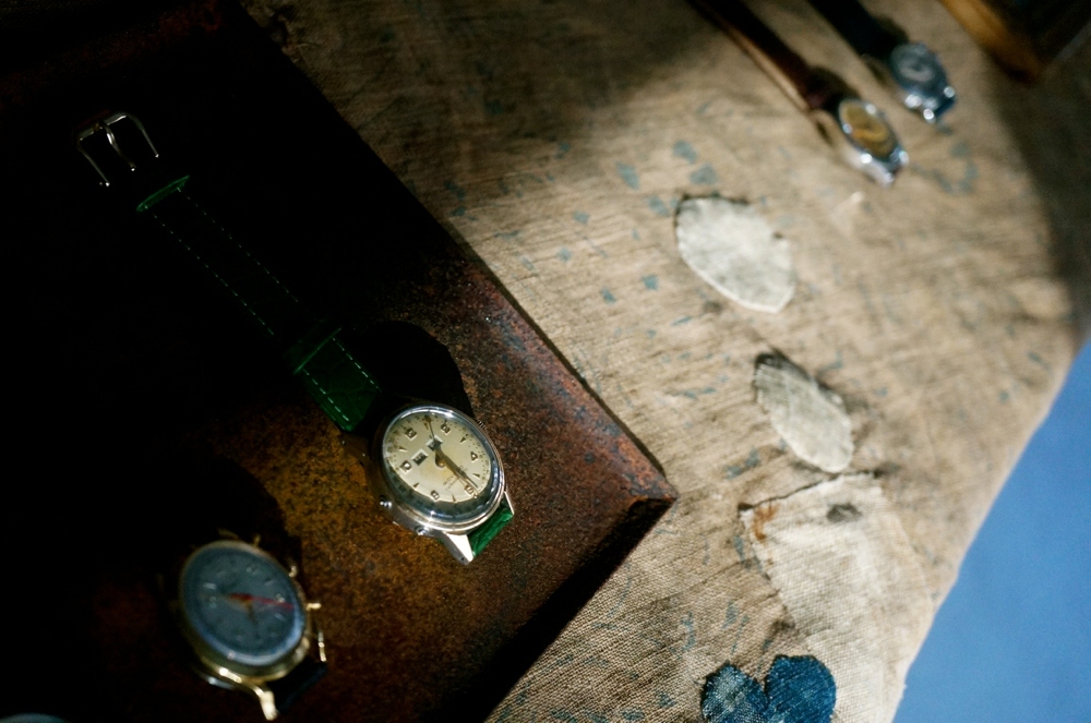 古い布団用包布を柿渋染めし、継ぎ縫い・継ぎ当てされた作品。恵比寿店はまだ内装が入っていないので、こういう雰囲気のある布に助けられます。その存在だけでなにか別の「作用」を生む作品に僕は惹かれますが、advintageの腕時計も、そういう存在でありたい。