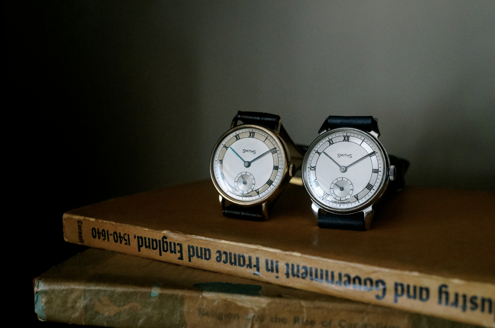 この3本はいずれも〈スミス〉が製造を手掛けた腕時計。第二次大戦後、純英国製腕時計の製造を開始したスミスは、数多くのJ.W.ベンソンのショップウォッチを手掛けることになりましたが、このローマン・インデックスを基調とした文字盤は、元はスミスが用いていたデザインに源流を見出すことができます。